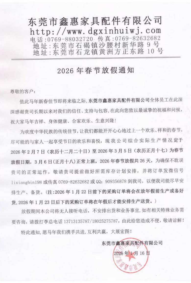 为欢度中华民族的传统佳节,让我们都能开开心心地过上一个欢乐、祥和的春节尽可能的与家人一起享受节日的欢乐和喜悦,现我公司综合实际生产情况定于2026年2月7日(农历二月二十日)至2026年3月5日(农历正月七)为春节放假日期,3月6日(正月十八)正常上班,2026年春节放假共26天,为确保不误贵司的正常运作,敬请贵司提前做好所需库存计划安排,并将订单发微信号lixiangbin198或传真 0769-82632682或QQ:909356878到我司,以便我司能尽早安排生产、备货。(注:2026年1月22日前下的采购订单将会在放年假前生产或备好货,2026年1月23日后下的采购订单将在年假后才能安排生产送货。)
